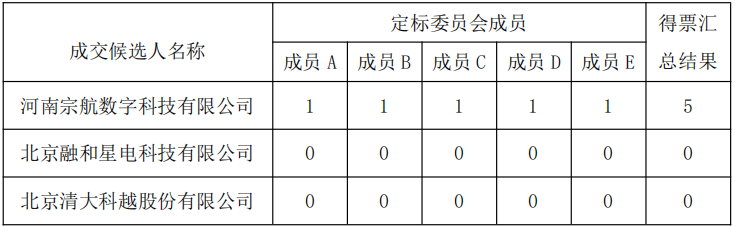 按照上述规则,经定标委员会投票,河南宗航数字科技有限公司票数为5票,票数最多且超过半数。